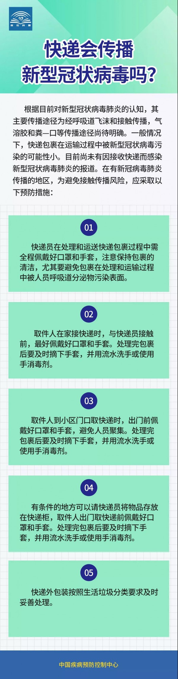 疫情之下,網上購物成為很多人獲取生活物資的首選方式,但也引發了一些擔憂,快遞會傳播新型冠狀病毒嗎?我們該如何更好地保護自己?中國疾控中心提示,快遞包裹在運輸過程中被新型冠狀病毒污染...