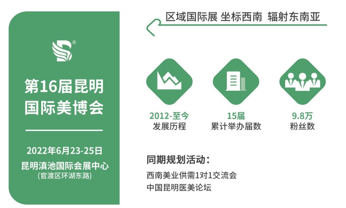 2022第16屆昆明國際美博會 時間:6月23-25日地點:昆明滇池國際會展中心17號館 聯系人:趙麗15820035503 參展理由: 1.傳播公司品牌知名度,傳到品牌形象,促...