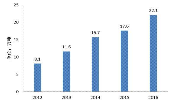 圖2 2012-2016年我國嬰幼兒配方乳粉進口量