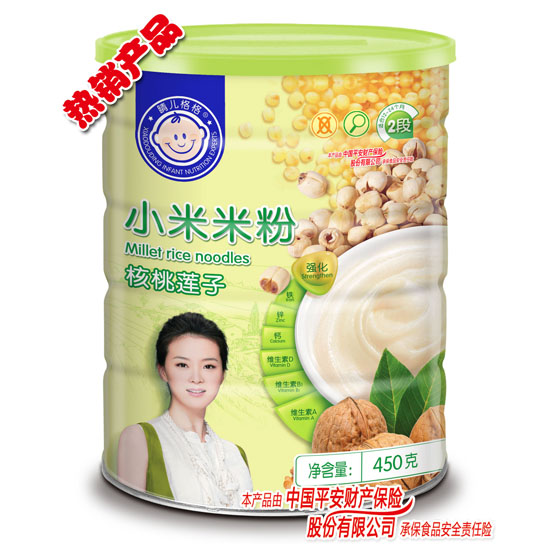 晴兒格格小米米粉營養優化、原料優化、配方優化。米粉分段明確,滿足多個輔食添加階段寶寶營養需求,更有中國平安財產保險股份有限公司承保“食品安全責任險”,知名影星為它代言,是80%的中國媽媽,2000余家母嬰店的共同之選。 |