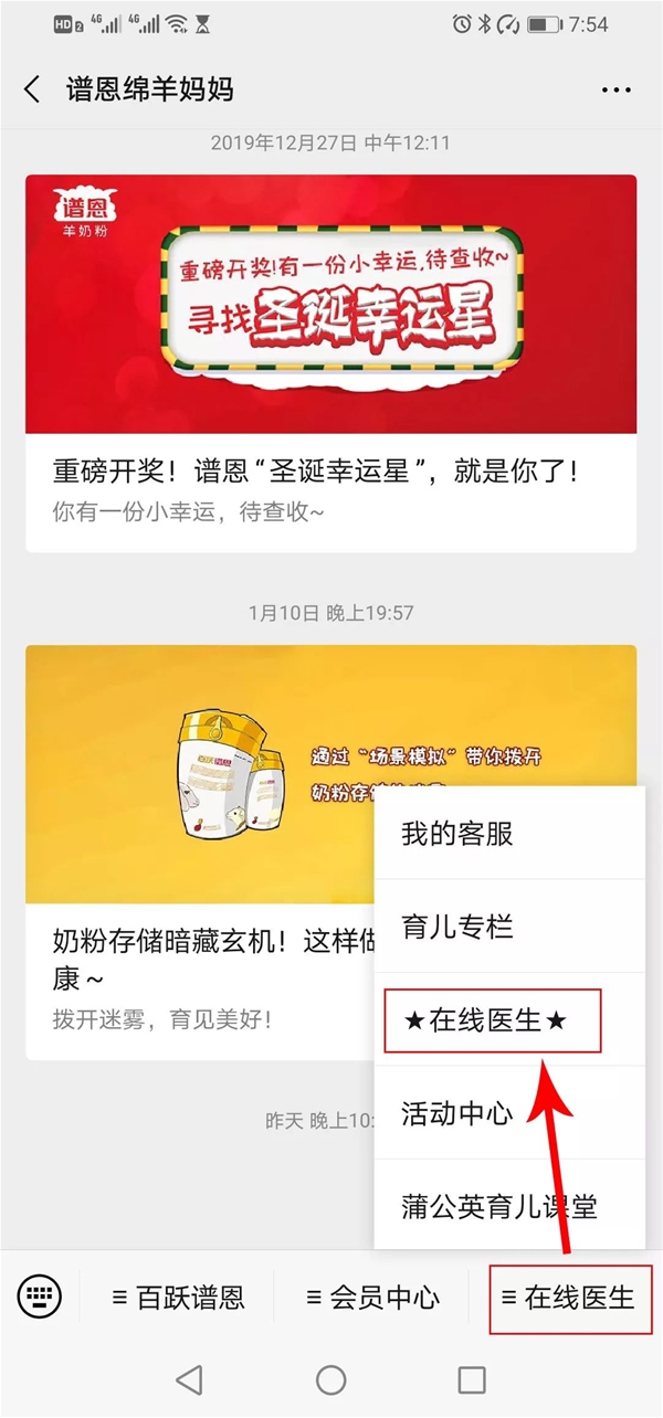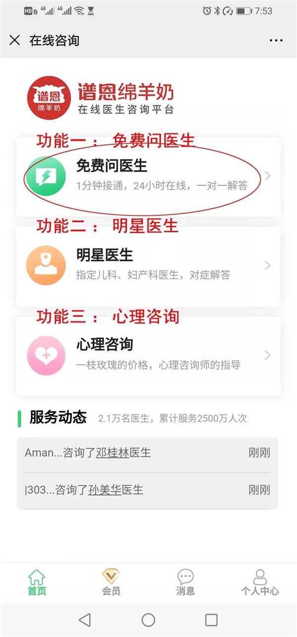 兩大主要功能:免費問醫生和明星醫生 免費問診方式: Step1:關注“譜恩綿羊媽媽”微信公眾號,點擊菜單欄“在線醫生”