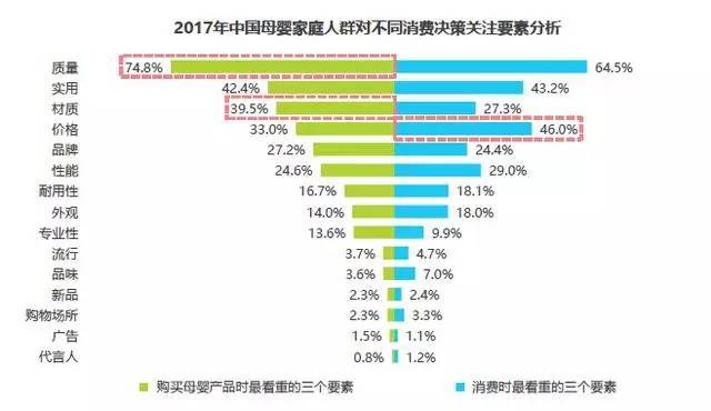 母嬰產品消費更注重質量和材質,對價格的敏感性相對較低 與其他類型的消費相比,母嬰家庭人群在購買母嬰產品時,更關注產品的質量和材質,重視度分別達到74.8%和39.5%,遠高于進行普通消費時對它們的重視度。此外,母嬰家庭人群在購買母嬰產品時,對價格的敏感性相對較低,重視度僅為33.0%,遠低于進行普通消費時對此的重視度。母嬰產品的質量好壞和材質情況直接關系到母嬰健康和安全,因此,大部用戶寧可花費較高的價格,消費高質量、優材質的母嬰產品。