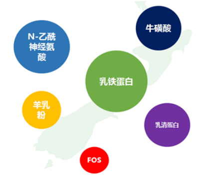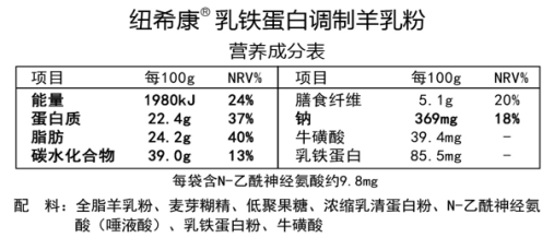羊奶的脂肪球與蛋白質顆粒只有牛奶的1/3,且顆粒大小均勻。 羊奶中乳蛋白含量高,因此蛋白凝塊細而軟。 羊奶的脂肪結構中,碳鏈短,不飽和脂肪酸含量高,呈良好的乳化狀態。 羊奶的酪蛋白結構與牛奶中的不同:在羊奶中主要含a-2S酪蛋白,β-酪蛋白,這兩種酪蛋白易被酵母分解,而牛奶中主要含a-1S酪蛋白。 羊奶中的免疫球蛋白含量很高。 乳鐵蛋白 我們都知道隨著奶粉行業的發展,乳鐵蛋白逐漸走進媽媽們的視野,國家也出具了相關的乳鐵蛋白添加標準,根據國家標準GB 14880-2012的規定,鐵蛋白只能添加到調制乳、調制乳粉、風味發酵乳、嬰幼兒食品中且含量≤100mg/100g。但是因為市場競爭關系,導致乳鐵蛋白的添加十分混亂。下面我們來詳細了解一下乳鐵蛋白: 什么是乳鐵蛋白? 乳鐵蛋白是乳汁中一種重要的非血紅素鐵結合糖蛋白,是母乳中的一種天然營養成分,主要由乳腺上皮細胞表達和分泌。被認為是一種新型抗菌抗癌藥物和具開發潛力的食品和飼料添加劑。 根據GB 14880-2012中的乳鐵蛋白含量≤100mg/100g得知,在這個范圍內應該是比較合適的。紐希康乳鐵蛋白羊乳粉由新西蘭GMP制藥集團生產,每100克羊乳粉添加85.5毫克乳鐵蛋白,確保每袋添加0.855毫克乳鐵蛋白。 2、燕窩酸(N-乙酰神經氨酸——唾液酸) 唾液酸是一種能使唾液產生光滑感覺的負電荷離子。目前仍知是神經節苷脂的傳遞遞質,并且是大腦的組成部分。我們通俗成為燕窩酸。