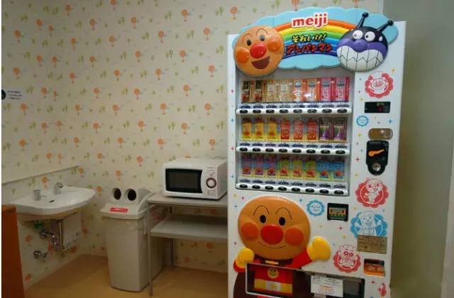↑嬰兒室內(nèi)的自動(dòng)售貨機(jī),比照幼兒身體設(shè)計(jì),就連飲料盒都比一般的小,適合孩子的小手拿握。 ↑嬰兒室允許男性進(jìn)入給孩子沖奶粉,換尿不濕。而哺乳區(qū)內(nèi)是一個(gè)個(gè)獨(dú)立的哺乳室,男性止步。墻上有應(yīng)急按鍵。