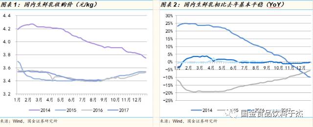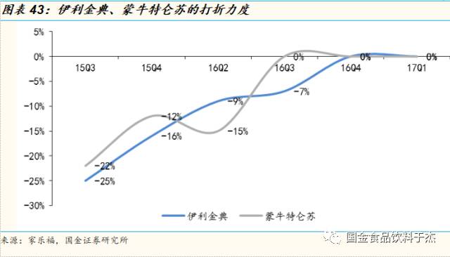 2015 年行業(yè)惡性戰(zhàn)爭開始:2015 年開始,原材料生鮮乳價格一直處于低位,部分本以上游為主營業(yè)務的企業(yè),開始轉向下游乳制品業(yè)務。他們以促銷低價的策略搶占市場渠道,其他企業(yè)亦盲目跟隨,整體液態(tài)奶市場打折幅度較大,以上海家樂福為例,2015 年 Q3 蒙牛特侖蘇,買滿 66 元減扣 15 元,打折幅度達 22% ,而伊利金典活動為買兩箱第二箱半價,打折幅度達 25% 。