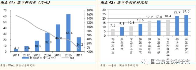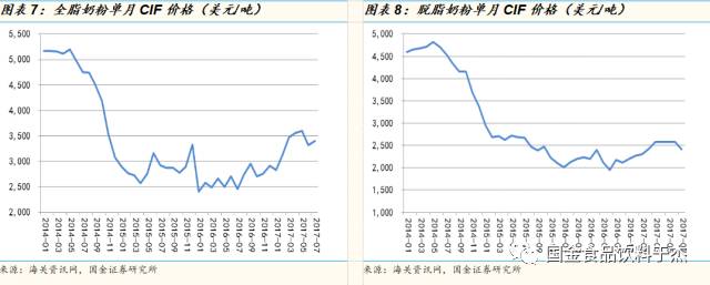 高價奶粉持續(xù)到岸, 期望帶動國內生鮮乳的轉化需求 最新 7 月份到岸的全脂奶粉換算成生鮮乳價格約為 3.2 元/kg, 已經低于目前 3.41 元/kg的國內生鮮乳收購價格。今年 5 月份全脂奶粉到岸價最高,但短期對國內奶價提振不明顯。我們期望下半年在到岸全脂奶粉價格繼續(xù)平穩(wěn)高價的情況下,能夠帶動國內生鮮乳轉換需求的提升,從而帶動收購價格的上升。