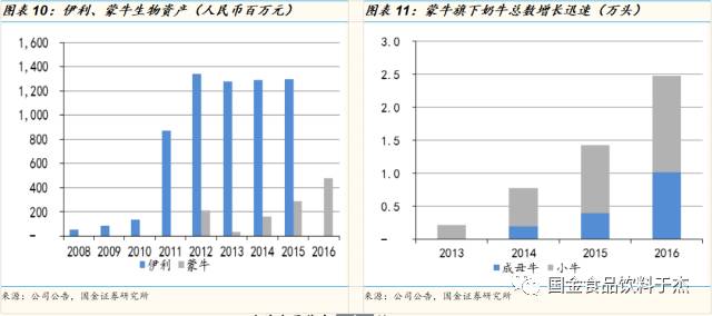 2010 年開始,伊利的資本開支開始大幅高于蒙牛,我們認為這和伊利一直以來加強奶聯(lián)社+自有牧場建設是分不開的,而蒙牛則打出“輕資產”牌,依靠第三方奶源,著力于自身強大的營銷模式在前期迅速占領市場。蒙牛近年來也開始加強自身奶源建設,生物資產投入逐年增加,而伊利由于轉讓了優(yōu)然牧業(yè)股權,生物資產大幅減少。