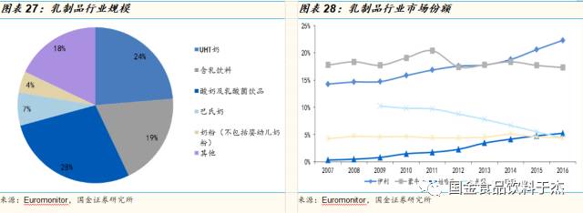 蒙牛和伊利的財務數據比較 伊利市場份額領先于蒙牛 今年上半年,伊利錄得收入 335 億元 vs 蒙牛收入 295 億元,收入規(guī)模差距約為 11.9% ,其中液態(tài)奶伊利收入 265 億元 vs 蒙牛 254 億元,差距拉大至 4.2% ;奶粉伊利收入 30.4 億元 vs 蒙牛 17.9 億元,兩者的奶粉收入由于去年的低基數都出現了同比的改善;而冷飲伊利收入 32.4 億元 vs 蒙牛 19.9 億元,由于今年天氣較為炎熱以及產品主動調結構,兩家冷飲收入都同比 +10% 以上。蒙牛在奶粉和冷飲的收入差距分別縮小至41% 和 39% 。