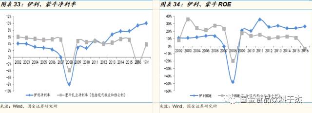 蒙牛收入更集中于液態(tài)奶,伊利高毛利產品占比較高 2016 年伊利毛利率達 37.9% 高于蒙牛的 32.8% ,我們認為主要是由于: 1)伊利奶粉收入占比高,2016 年占總收入的 9.1% vs 蒙牛的 5.9%,而奶粉的毛利率較高:伊利奶粉板塊毛利達到 56.2% ,遠高于液態(tài)奶總體的 37.9% ,而蒙牛旗下的雅士利 2016 年毛利達 47.1% ,不含雅士利蒙牛毛利則下降至29.6%; 2)伊利牛奶飲品銷量領先:根據歐睿的數據,終端伊利牛奶飲品銷售額約為蒙牛的兩倍,由于牛奶飲品原料多為大包粉,我們預計毛利和冷飲相似,毛利率超 40% ; 3)伊利高毛利液態(tài)奶產品占比高:伊利液態(tài)奶業(yè)務中我們估測高毛利產品約占液態(tài)奶總體銷售額的 50%,而蒙牛的明星品牌(特侖蘇,冠益乳等)+機會品牌(純甄等) 2016 年銷售占比約為 45% 。