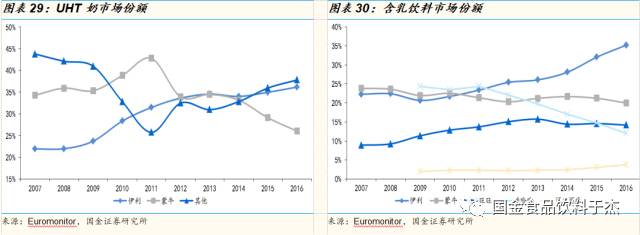 而兩家終端市場的市占率數據方面,各家咨詢機構數據不盡相同?傮w來說,伊利在常溫產品領域領先于蒙牛,而在低溫產品領域蒙牛受益于君樂寶和達能的低溫酸奶優(yōu)勢,領先于伊利。