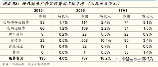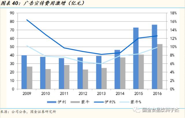 我們認為隨著行業(yè)內惡性競爭在 2016 年下半年逐步好轉,各大企業(yè)并沒有新的大單品推出之際,廣告宣傳費用有望較 2016 年有所下滑。但考慮到整體乳制品行業(yè)已經進入一個較為平穩(wěn)的發(fā)展時期,我們認為正常的營銷費用如地推費、貨架費、促銷返點費用下降幅度有限,更多調節(jié)在于軟廣的投放費用。