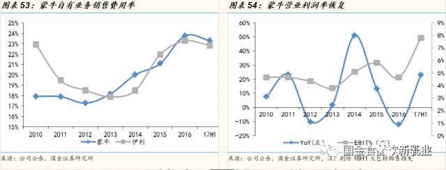 今年隨著產品結構的逐漸優(yōu)化,公司上半年的毛利率同比 +1.9ppt 至 35.6% (不包含現代牧業(yè)),預計隨著上游供應協(xié)同進一步順暢,毛利率有望繼續(xù)提升,對沖部分包材和運輸費用上升的成本。而費用方面,銷售費用投放目標更為集中有效,管理層預計蒙牛主體銷售費用率不會超過 2016 年 25% 的水平。在毛利提升以及銷售費用投放增效的作用下,17H1 蒙牛的 EBIT 利潤率同比 +2.1ppt 至 7.8% ,若剔除去年上半年約 3.15 億的大包粉拋售損失,EBIT 利潤率同比 +0.8ppt ,EBIT值同比 +23% ,利潤水平恢復顯著。