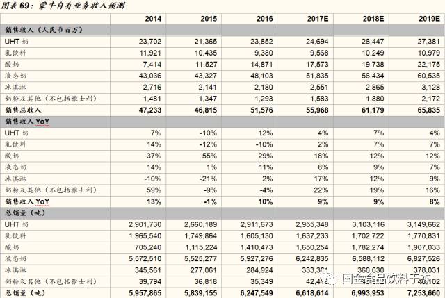 盈利預測 今年下半年隨著蒙牛高端產品的推出以及對明星產品的集中投入,預計收入端依然能維持高個位數的增長,蒙牛主體 2017-2019 年收入分別為560.0 億 / 611.7 億 / 658.4 億元,同比 +8.5% / 9.3% / 7.6%,雅士利 2017-2019 年收入分別為 22.0 億 / 22.7 億 / 23.4 億元,同比持平+3%。這樣蒙牛總體收入 2017-2019 年收入分別為 581.7 億 / 634.5 億 / 681.7 億元,同比 +8.2% / 9.1% / 7.4% 。