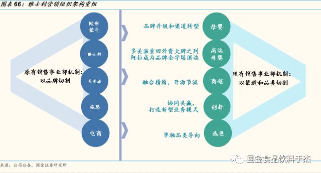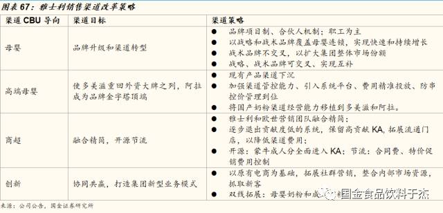 (2)營銷組織重組:構建以渠道和品類切割的 CBU 架構 公司也調整了銷售組織策略架構,營銷由原先以品牌切割為主的事業(yè)部機制,轉化為以渠道切割為主的業(yè)務單元,更好的根據每個渠道特點,有的放矢,加強品牌和渠道的共振力。