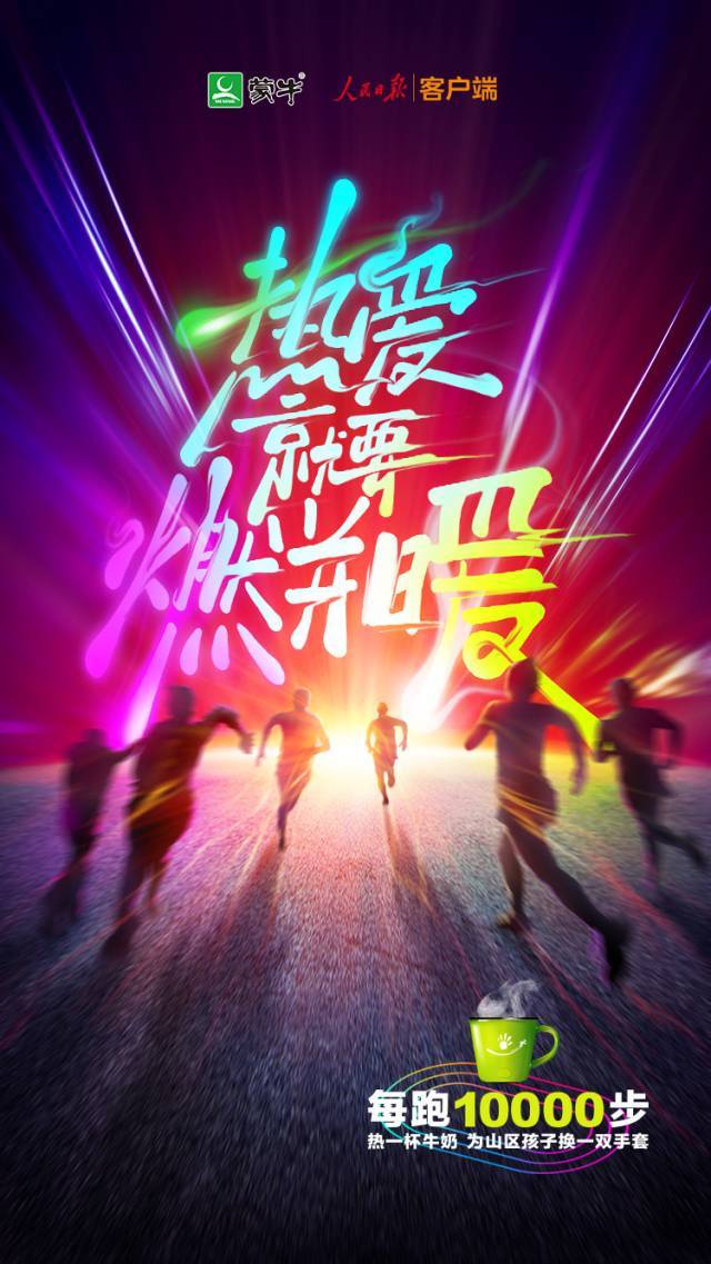 2016年11月24日感恩節(jié),由蒙牛聯(lián)合人民日報客戶端發(fā)起“熱愛就要燃并暖”公益活動暖心開跑。13座城市13所大學校園,開啟冬日最暖愛心接力。通過跑步積累10000步,兌換一杯熱牛奶,同時還能為山區(qū)小朋友捐贈一雙手套。