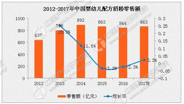 中國嬰幼兒配方奶粉市場規模 中國嬰幼兒配方奶粉市場指國內及國際品牌于中國所銷售的嬰幼兒配方奶粉產品,不包括中國消費者所進行的跨境購買。據中商產業研究院發布的《2017-2022年中國嬰幼兒奶粉行業研究及市場投資決策報告》顯示:中國嬰幼兒配方奶粉市場的零售額從2012年的人民幣637億元增至2016年的人民幣844億元,復合年增長率為7.3%。于2014年達到高位,為人民幣892億元,自2012年以來相對較高增長率之后,中國嬰幼兒配方奶粉市場零售額于2015年及2016年略有下降,這主要是由于出生率下降及中國消費者跨境購買量增加所致。展望未來,由于消費者更加重視產品質量及安全以及嬰幼兒配方奶粉中的營養成份,以及中國自2015年放寬獨生子女政策等諸多正面因素,高端市場藉此得以增長,預期將帶動中國嬰幼兒配方奶粉市場由2016年的人民幣844億元增至2017年的人民幣863億元。