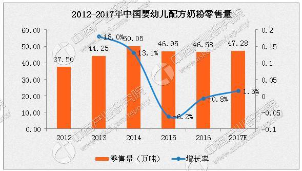 數據來源:中商產業研究院整理 中國的嬰幼兒配方奶粉零售量由2012年的37.5萬噸增至2016年的46.58萬噸,復合年增長率為5.6%。中國嬰幼兒配方奶粉市場零售量的增長趨勢與零售額相仿,而其復合年增長率較零售額為低,主要因高端產品的需求增加導致嬰幼兒配方奶粉產品的價格持續增長所致。在高端嬰幼兒配方奶粉市場的帶動下,估計中國嬰幼兒配方奶粉市場的零售量將從2016年的46.58萬噸以2.2%的復合年增長率增長,2017年預計達到47萬噸以上。