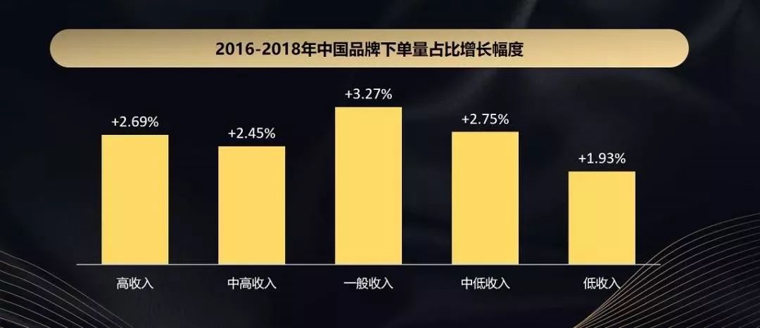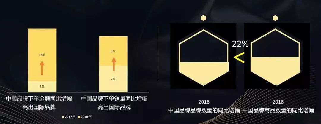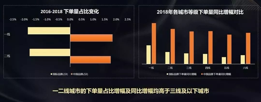 -2017年中國品牌商品的下單金額同比增幅高出國際品牌3%,2018年中國品牌商品的下單金額同比增幅高出國際品牌14%;