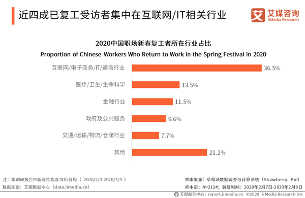 近四成已復工受訪者集中在互聯網/IT相關行業 iiMedia Research(艾媒咨詢)數據顯示,互聯網/電子商務/IT/通訊行業、醫療/衛生/生命科學、金融行業為已復工受訪者人數最多的三大領域,占比分別為36.5%、13.5%、11.5%。