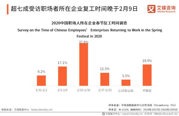 超七成受訪職場者所在企業復工時間晚于2月9日 iiMedia Research(艾媒咨詢)數據顯示,26.3%的受訪職場者表示其所在企業在2月10日前已經復工,其中2月3日前復工的受訪職場者占9.2%;73.7%的受訪職場者表示其所在企業復工時間晚于2月9日。