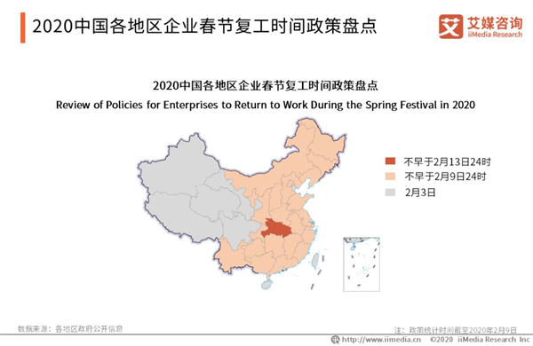 超七成受訪職場者所在企業仍未復工,已復工者主要集中在互聯網相關行業 26.3%的受訪職場者表示其所在企業在2月10日前已經復工,其中2月3日前復工的受訪職場者占9.2%;36.5%的已復工受訪者集中在互聯網/電子商務/IT/通訊行業。 超四成新春居家辦公者辦公時間延長,超三成新春居家辦公者認為工作效率有所提升 41.1%的居家辦公受訪者日均辦公時長延長,居家辦公日均時長縮短的受訪者占24.2%;34.7%的新春居家辦公者認為自身工作效率提升,26.3%的受訪者透露其居家辦公效率下降。 不同職級人員對居家辦公利弊評價呈現差異 40.0%受訪基層員工認為居家辦公利大于弊,40.9%受訪中層管理者認為居家辦公利弊相當,42.9%受訪高管/負責人認為居家辦公弊大于利。 “新冠肺炎”防控期間職場人最關心薪資發放,近六成受訪者認為所在企業業績會受拖累 “新冠肺炎”防控期間,薪資發放為職場人最關心問題,占比達48.5%;59.4%的受訪職場人認為“新冠肺炎”會導致其所在企業第一季度業績下滑。 以下為報告節選內容 2020中國各地區企業春節復工時間政策盤點 2020年春節期間,為防控新型冠狀病毒感染肺炎疫情,中國國務院于1月27日發布通知,將春節假期延長至2月2日。后因疫情發展迅速,多地政府陸續發布延遲企業復工政策文件,其中超20個省份要求企業復工時間不早于2月9日24時。
