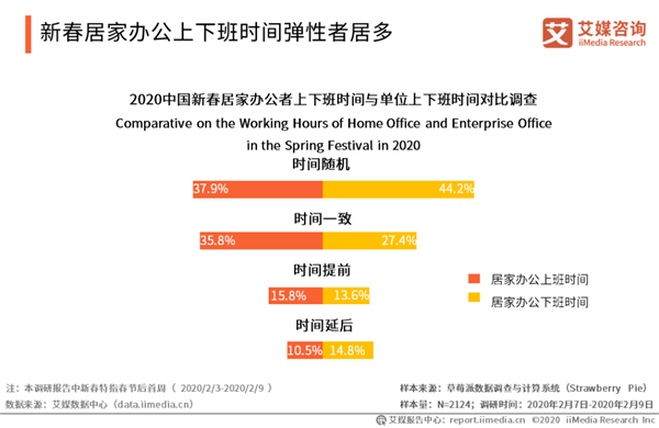 新春居家辦公上下班時間彈性者居多 iiMedia Research(艾媒咨詢)數據顯示,與在單位辦公相比,多數居家辦公受訪者上、下班時間較為隨機,占比分別為37.9%、44.2%;居家辦公與單位辦公上、下班時間保持一致的受訪者分別為35.8%、27.4%;此外分別有15.8%的居家辦公者上班時間提前,14.8%的居家辦公桌下班時間延后。