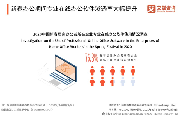 新春辦公期間專業在線辦公軟件滲透率大幅提升 iiMedia Research(艾媒咨詢)數據顯示,76.8%的新春居家辦公者表示其所在企業在此期間嘗試了新型的在線辦公軟件(如考勤簽到、會議溝通、項目管理/協助、在線審批等)。艾媒咨詢分析師認為,此次新春居家辦公為偶發性事件,雖然推動了專業在線辦公軟件的滲透,但由于多數在線辦公軟件功能較為單一,未來能否成為企業長期使用的工具還有待進一步觀察。