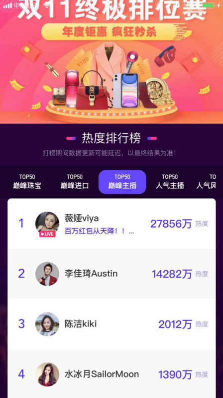 超過50%的商家都通過直播獲得新增長。當然直播間的銷售額對比雙11總成交額來說,還是有很大差距的,淘寶直播成交只占據了總交易額的13分之1,這也說明直播銷售的發展潛力仍然巨大。 淘寶直播雙11熱度排行榜顯示,TOP50巔峰主播榜單中薇婭和李佳琦分別以4.5億和3.4億的熱度位居第一、二名,而第三名“陳潔kiki”熱度僅為5056萬,烈兒也才1701 萬!