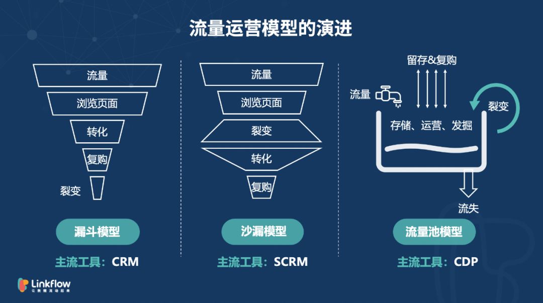 漏斗模型 這個模型下,工作重心會放在引流和轉化,啥事兒都要花錢,但短時間窗內可控性較好(不太壓價的話總能買到量),適合在流量便宜的時候拼命搞量賣貨賺錢。這個階段,CRM非常流行,企業只對客戶進行管理而不培育。缺點則是靠天吃飯,對外界流量成本漲跌很敏感,流量大幅度漲價的時候就郁悶了。問題在于,大部分人一定會越來越郁悶,因為巨頭越來越牛逼,流量越來越集中,也就自然會越來越貴。 沙漏模型 隨著采買流量價格逐步上漲,很多人就轉換了思路——用戶現在大部分時間消耗在社交媒體(如微信)上,那我不買廣告啊,直接讓用戶幫我在微信上傳播裂變豈不更好。這時沙漏模型就流行起來,把首要工作目標從引流轉化變成了裂變,整個模型長得像沙漏。拼多多之類的顯然就是這個模型,去年很流行的『邀請3個好友就免費聽課』之類的也都是。所以這時,在微信環境下運營的工具——SCRM非常流行。 流量池模型 楊飛《流量池》的發布點燃了「苦流量久矣」的營銷圈,隨后,大家幾乎不再談論「如何去找一個新的流量洼地」,反而「如何有效轉化流量?」「如何通過運營手段,讓流量的轉化更加可持續?」「如何構建私域流量池?」成了熱議話題。 流量池模型需要對流量進行大量的存儲、運營、發掘,再獲得更多的流量。這個模型對于數據基礎、客戶響應能力和效果追蹤能力的要求極高,顯然CRM和SCRM無法滿足企業需求,CDP逐漸進入大家視野。 流量池模型支撐企業全域流量運營, 破解后流量時代增長瓶頸 要利用流量池模型實現流量再生并非易事,企業需要具備以下能力,才能做出助力業務增長的成功營銷。