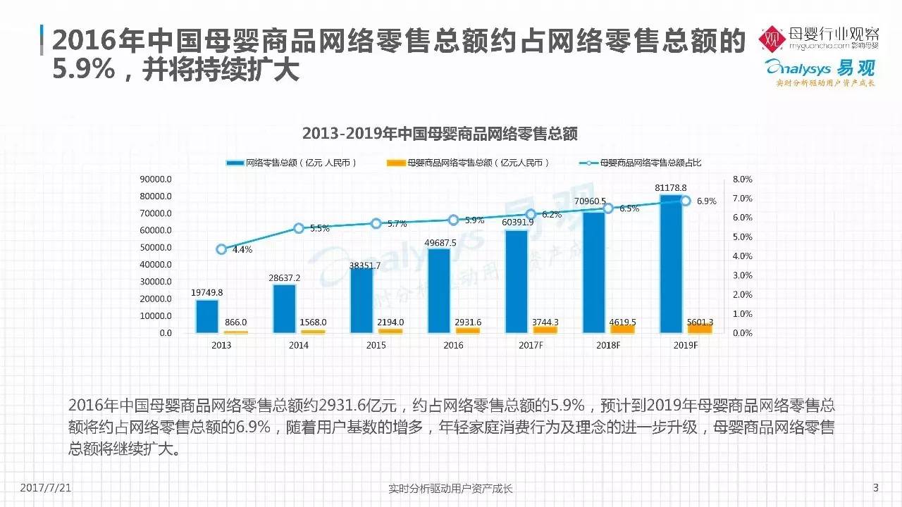 在二胎政策的開放下,2016年出生人口數量同比增長了11.5%,母嬰行業迎來了它的第二次人口紅利,整個行業隨著新生兒數量的攀升,市場規模也在持續擴大。 2、母嬰網絡零售份額