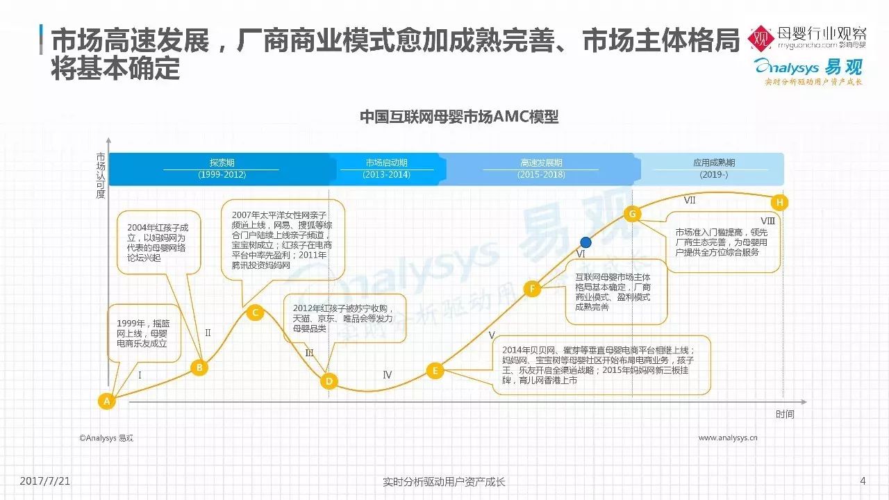 從中國的母嬰市場網絡零售情況來看,母嬰市場網絡零售占到整體網絡零售總額的5.9%,我們預計2017年能達到6.9%左右的份額。原來大家覺得做母嬰更多的應該在寶寶層面做,有一個數據顯示2017年媽媽消費占比也是在提升的,這意味著現在家庭消費的觀念已經越來越強了。 3、互聯網母嬰市場AMC模型