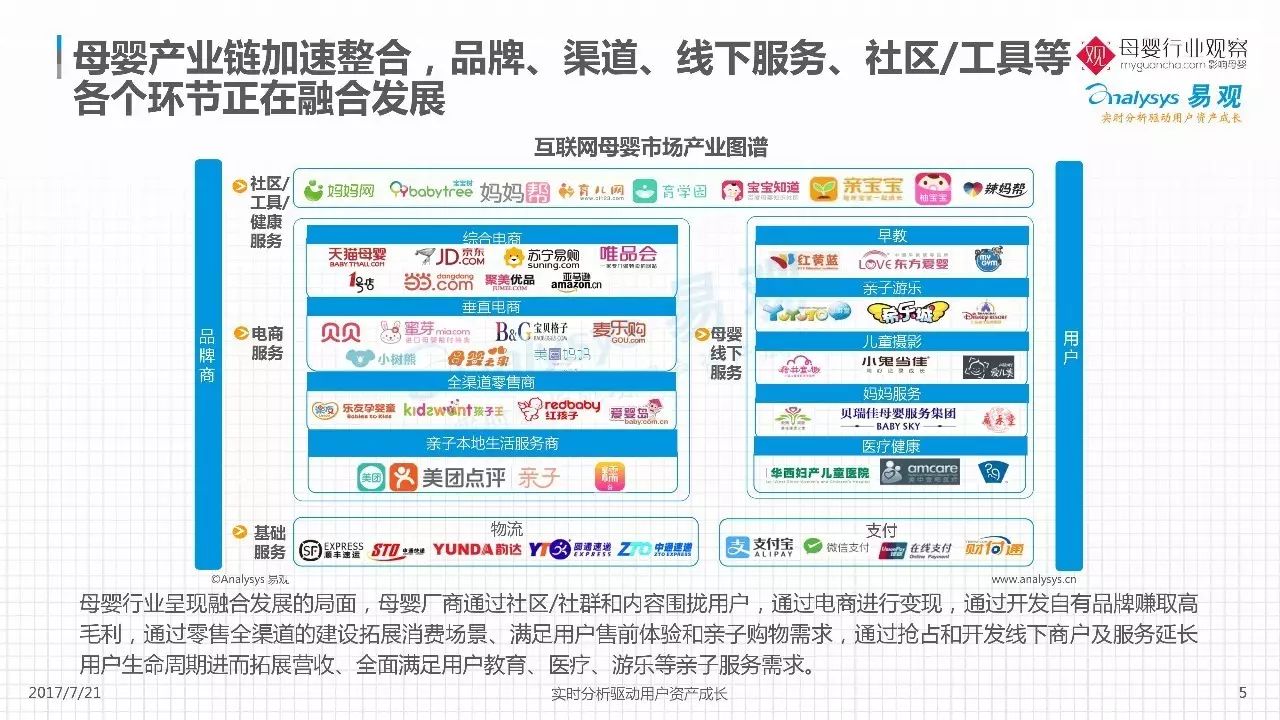 上圖對整個互聯網母嬰市場做了AMC的展現,從1999年互聯網母嬰市場的第一家企業成立,一直到2019年整個行業未來的發展,我們把一些非常關鍵的節點做了標注,現在行業處于高速發展期,而且廠商之間的商業模式越來越完善了,主體市場格局基本上已經確定了。 4、母嬰產業鏈加速融合