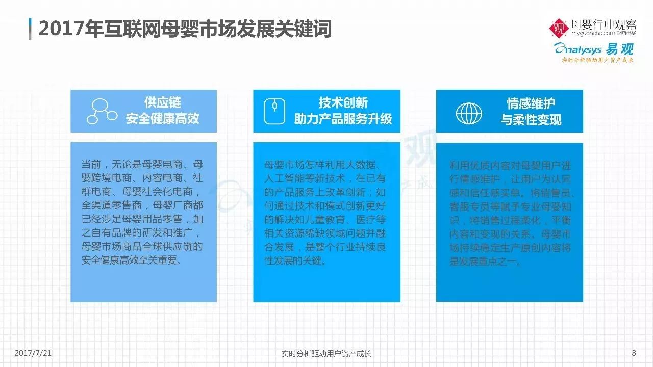 大部分母嬰廠商都是基于社群,母嬰社群帶來的經濟效益是非常顯著的,而且用戶從最開始的消費者到最后角色會發生轉變,很多廠商的一把手當初是從一個媽媽變成一個網紅之后開始進入這個行業去創業。在這個過程當中社交是必不可少的,基于社交內容的承載、人際關系的傳播也都是非常重要的。 7、互聯網母嬰市場發展的三個方向
