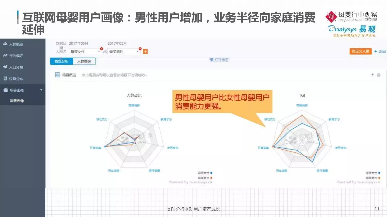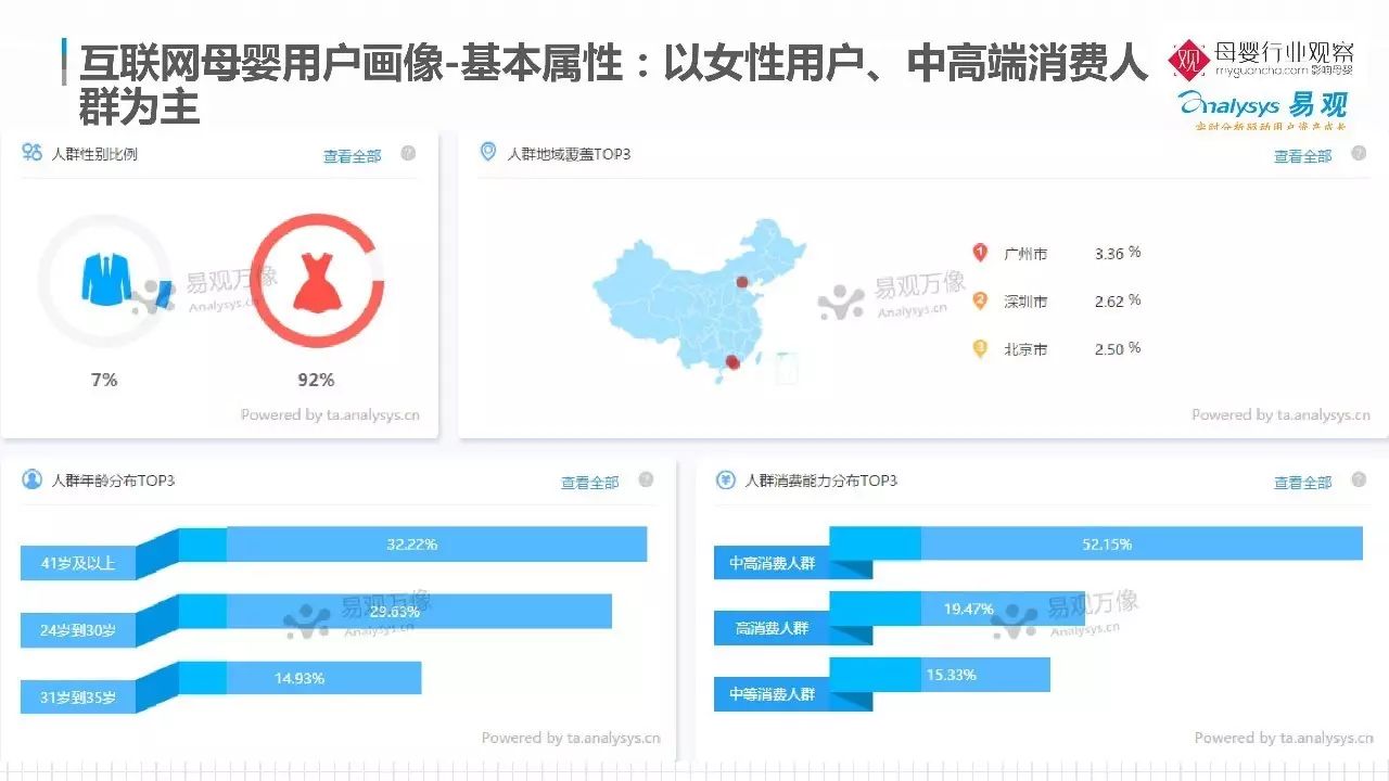 以上講了產業宏觀的東西,接下來講一些具體的數據分析。首先是整個互聯網母嬰市場的用戶畫像,行業用戶基本上以女性用戶為主,而且消費水平相對來說是中高端。另外有一個地方值得關注,2017年我們發現男性用戶的比例也在逐漸提升,有一些廠商代表男性用戶每個月都在保持著非常穩健地增長。 2、母嬰廠商需重視醫療消費