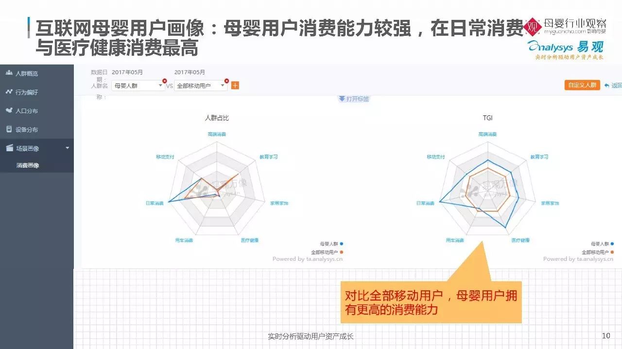 上圖分別是整個移動互聯網用戶在消費上的對比和母嬰人群在消費上的對比。大家可以清晰地看到,母嬰用戶的消費能力是非常強的,而且在日常醫療健康上相對于整個全網用戶來說也擁有非常高的消費能力,所以未來醫療消費在母嬰行業一定是可延展的。 3、母嬰消費向家庭消費延伸