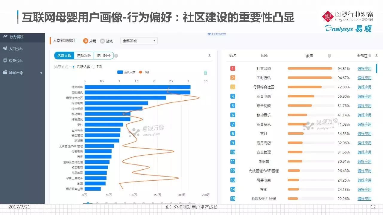 最后一張圖,給大家展現的是整個母嬰用戶畫像里面用戶的行為偏好,再一次印證了我們前面所提到社交的重要性。我們對于全網用戶做過一個比較,發現母嬰用戶在社交上的指數是高于很多行業的,很多父母都有曬娃或者曬孩子成長經歷的情感上的訴求,希望在這些母嬰平臺上尋找到更多的共鳴和話題,所以整個母嬰行業社交性是非常凸顯的。社交是母嬰行業必不可少的一個環節,這塊廠商要基于高質量的內容、有誠信的內容,不斷地提升平臺在社交上的價值。 |