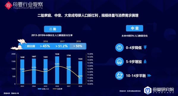 二胎家庭、中童、大童成母嬰人口新紅利,規(guī)模體量與消費需求俱增。我們看到2017年開始二胎率已經(jīng)超過了一半,因為這個數(shù)字,整個母嬰行業(yè)的結構組成會發(fā)生一些潛移默化的變化。例如我們說一胎照書養(yǎng),二胎當豬養(yǎng),二胎媽媽對產(chǎn)品的需求,對母嬰對育兒的認知是不一樣的。未來中國5年人口數(shù)量變化,0-4歲的人口是下降的,5-9歲是增加的,10-14歲是平衡的。