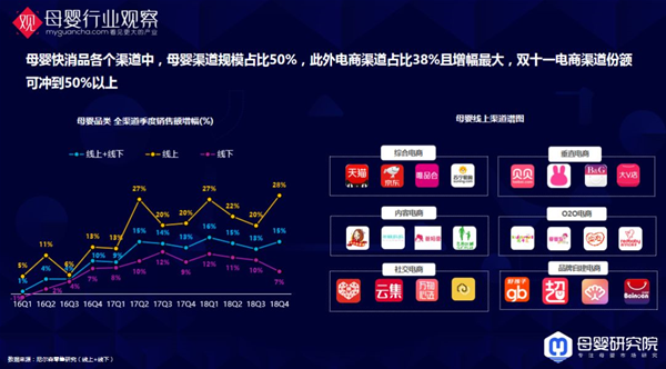 此外,我們未來要深耕五大核心人群代表:個性獨立的職場辣媽、力挺國貨的年輕奶爸、養(yǎng)娃不惜金的小城爸媽、注重產(chǎn)品力的精致派、時髦愛玩兒的大小孩。 這一年,母嬰零售線上增長瓶頸出現(xiàn)了嗎? 母嬰快消品各個渠道中,母嬰渠道規(guī)模占比50%,電商渠道占比38%且增幅最大,雙十一電商渠道份額可沖到50%以上。線上的份額還在增長,尤其是一些標品化的產(chǎn)品。