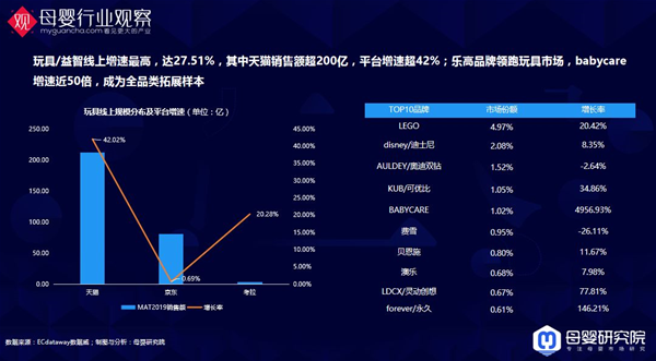 玩具/益智線上增速最高,達27.51%,樂高還是第一,babycare增速近50倍。