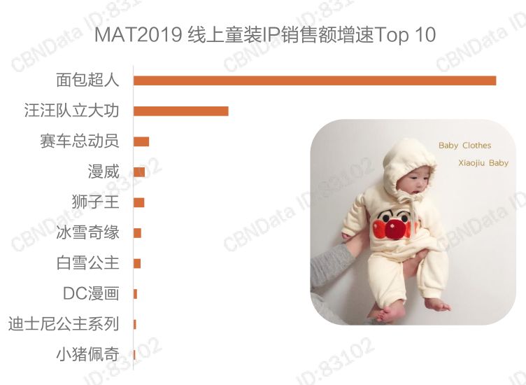 童裝IP的集中度比較高,但是IP的選擇要與時代結合,所以更迭是必需的。從增長速度來看,童裝頭部IP占比逐年下降,越來越多的新晉IP有爆發之勢。 線上童裝IP銷售額TOP10
