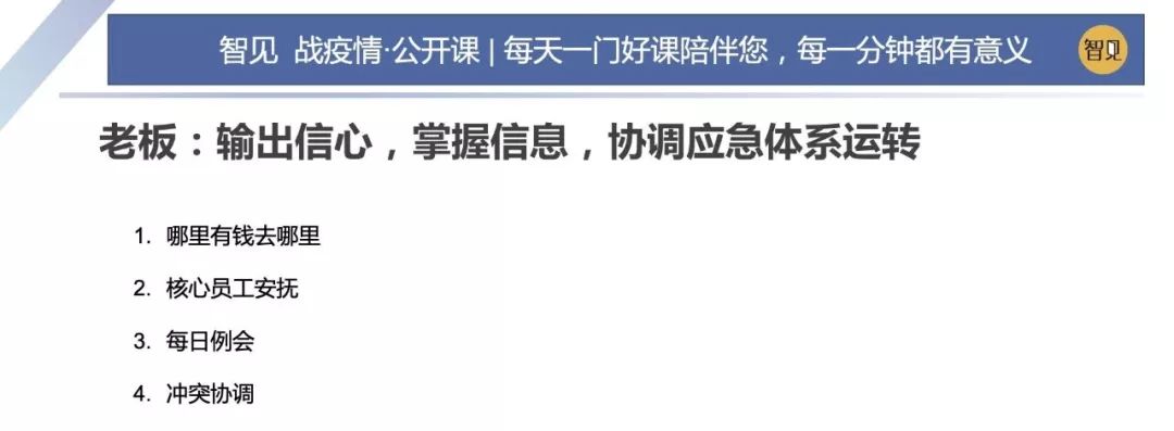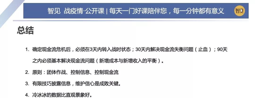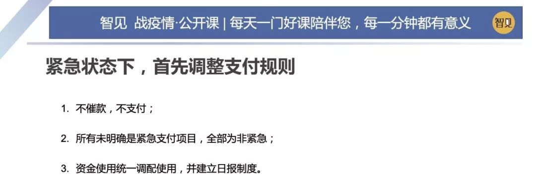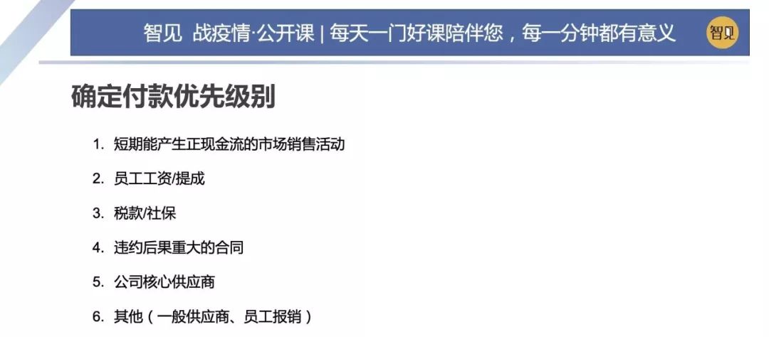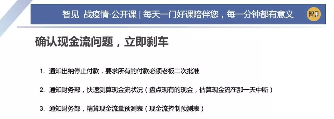 因為這場突如其來的疫情,這兩天西貝集團董事長賈國龍在接受采訪時說,西貝的現金流最多能撐 3 個月。老鄉雞董事長束從軒、九毛九集團董事長管毅宏等一些餐飲業大佬也表示,他們的餐飲企業現金流最多能撐 1 個半月。恒大研究院院長任澤平指出,受疫情影響,餐飲、旅游、電影、交運、教育培訓等行業沖擊最大,僅春節 7 天時間簡單估算的損失,電影票房 70 億(市場預測)+餐飲零售 5000 億(假設腰斬)+旅游市場 5000 億(完全凍結),這三個行業直接經濟損失已經超過 1 萬億。 這幾天國內眾多的投資機構的負責人,也紛紛給自己的被投企業打電話,詢問企業的現金流如何?可見,疫情對于企業經營的影響是非常直接而深遠的。 面對疫情,現金流無疑是企業生存之本。本期「智見 戰疫情·公開課」請到了智見財稅合伙人傅旭東老師為大家帶來分享:應急狀態下的現金流管理 緊急狀態下的現金流管理 面對疫情,現金流無疑是企業生存之本。本期「智見 戰疫情·公開課」請到了智見財稅合伙人傅旭東老師為大家帶來分享:應急狀態下的現金流管理 「傅旭東:上海稅務師事務所合伙人,注冊會計師、注冊稅務師,22年財稅工作經歷,是上海市政府特聘服務企業的財稅專家,長期擔任上市公司風控管理人」 今年疫情對絕大多數的企業都產生了重大的影響,我們企業家要想辦法自救,活下來,轉危為機。企業活下來,最核心條件是現金流。