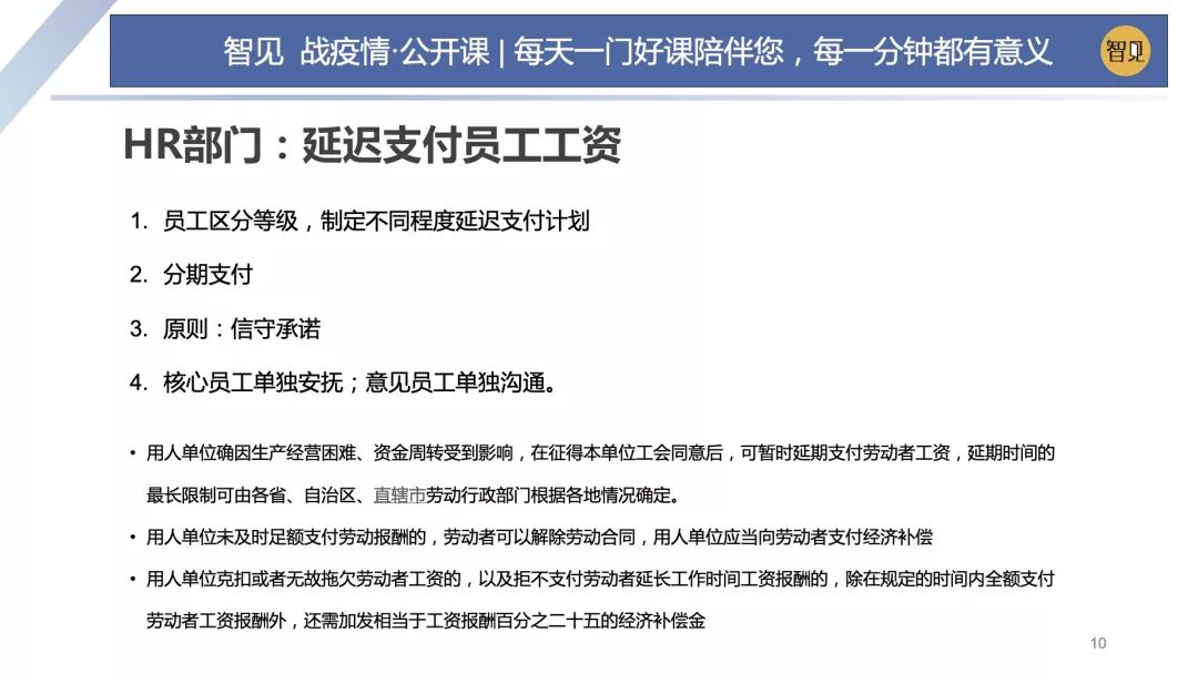 延遲支付員工工資是風險最大的一個行動,也是最讓人頭痛的一個行動。這件事處理不好就有可能讓公司分崩離析。 但是一旦做出了延遲支付員工工資的決策,就要堅決執行。我們在2018年這個案子中,當時財務部與HR部門詳細討論了所有的方案,包括某些人哪些人會產生問題,都列出了詳細的應對方案。 延遲支付員工工資這個信息不能過早泄露。正常情況下是在做出這種行動,就是發放工資當日,才向員工進行平凡的一個說明。 延遲支付員工工資方案中,我們首先對員工進行分類,員工分為:經理、區域經理,也有主管、普通員工。那為這些員工進行等級,然后制定不同的延遲支付計劃。在2018年的時候,我們跟金總商量,所有的員工全部統一,每個月先行支付5000元錢。 然后要求普通員工,剩下的工資是遞延30天,主管級以上的員工工資遞延三個月以上。 對于延遲支付工資,公司一旦做出承諾,財務部門一定要信守承諾,否則員工一旦對公司失去信念的話。整個團隊就喪失了戰斗力。 具體在執行的時候有很多細節,但是有一個行動必須要做,就是跟部分員工的單獨談話。 公司HR要挑出核心員工,如果有可能,由老板親自出面進行安撫。除了核心員工,公司一定會存在一些意見員工,就像意見領袖一樣,那這些員工也需要進行單獨溝通。金總的公司當時HR部門,財務部門各自成了一個小組,包括副總裁在內,單獨找核心員工給和意見員工一個個進行談話溝通。 HR延遲支付工資的一個行動,核心就是要留下核心員工。然后在整個團隊中要控制消息的傳播。另外,HR部門還要預備法律風險的一些發生。在整個過程中,老板需要親力親為參與進來,特別對那個核心員工。 一旦延遲支付員工工資以后,會導致勞動部門的一些處罰,在這里我們也提供一些政策解讀,給HR部門作為一個工具。 第一:用人單位產生經營困難資金周轉盈收到影響的話,工會同意可以延遲支付勞動者工資,這是合法的。具體延遲的時長由各個地方的勞動部門來制定。 第二:用人單位如果沒有及時支付勞動報酬,勞動者在極端情況下是可以解除勞動合同的。這時候按照規則,企業需要支付違約金的,這個補償金是工資報酬的25%。但是在2018年呢,我們實務中,800多人的員工確實有人投訴到勞動管理部門。但是我們跟勞動管理部門溝通完以后沒有給予公司什么處罰。 五.銷售和財務部門的分工:嚴控一進一出的計劃和執行 銷售部門和財務部門受到壓力主要來自于內部,有一定共性。