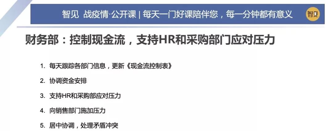 第一:采購部門。在2018年的這個案子中,首先給財務部門制定了單月的支付上限以及三個月的整個季度支付上限。也給采購部制定了一個付款平緩的一些要求。 第二:HR部門。金總的這家公司屬于勞動密集型企業,公司有800多人,每個月發放的工資占銷售收入的50%以上。大概有700萬到800萬的額度用于支付員工工資。HR部門發出了延遲發放職工工資的要求。具體給出了一個額度上限,在時間上也做出了一些平緩的要求。 第三:給銷售部門定出一個回款下限指標。銷售部門必須每天更新次日的銷售回款計劃,然后每天跟蹤自己的銷售回款狀態。 第三步:現金流應急狀態下的部門責任分工 財務部要負責控制信息,要給出資金分配方案然后居中進行協調。HR部門是負責職工,采購部門負責供應商,銷售部門負責擴大銷售回款,尋求新的現金流。老板主要是給予信心,然后控制各個體系運轉,還有一個很重要的就是解決矛盾。 這里要強調的是:在應急狀態下,企業的各部門優先級別要發生改變。這種狀態下,財務部門最重要,平時優先級別最高的銷售部門,需要圍繞著財務部的目標行動,如果銷售部門依然強勢的話,就很容易擊潰財務部門構建的處理危機的防火墻。