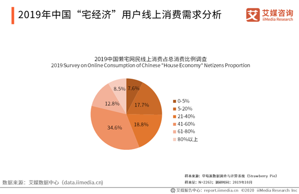 2019年中國“宅經(jīng)濟(jì)”用戶線上消費(fèi)需求分析 iiMedia Research(艾媒咨詢)數(shù)據(jù)顯示,2019年,21.3%懶宅網(wǎng)民線上消費(fèi)占總消費(fèi)的比例在61%以上,懶宅網(wǎng)民對線上消費(fèi)依賴程度較高。艾媒咨詢分析師認(rèn)為,互聯(lián)網(wǎng)的便利催生出懶宅群體,而懶宅群體又刺激了“宅經(jīng)濟(jì)”發(fā)展,未來隨著互聯(lián)網(wǎng)與配送技術(shù)的發(fā)展,配送的速度會更快,配送的區(qū)域會更廣,提供的產(chǎn)品及服務(wù)也更多更完善。