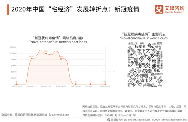 2020年中國“宅經(jīng)濟(jì)”發(fā)展轉(zhuǎn)折點(diǎn):新冠疫情 艾媒商情輿情數(shù)據(jù)監(jiān)測系統(tǒng)顯示,2020年1月23-2月3日期間,“新型冠狀病毒疫情”網(wǎng)絡(luò)熱度皆高于8000,引起國人的強(qiáng)烈關(guān)注。艾媒咨詢分析師認(rèn)為,公共衛(wèi)生事件的爆發(fā)導(dǎo)致線下需求向線上轉(zhuǎn)移,線上的消費(fèi)和娛樂需求短期內(nèi)會暴增,同時(shí)呈現(xiàn)出多元化的特點(diǎn)。因而此次疫情很有可能成為中國“宅經(jīng)濟(jì)”發(fā)展的一個(gè)轉(zhuǎn)折點(diǎn)。