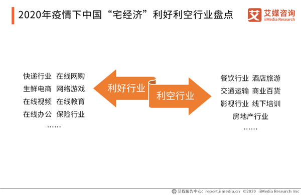 2019年,21.3%宅家網(wǎng)民線上消費(fèi)占總消費(fèi)的比例在61%以上,宅家網(wǎng)民對線上消費(fèi)依賴程度較高;77.1%宅家網(wǎng)民主要通過線上渠道進(jìn)行娛樂,其中最受歡迎的是影視音樂,占比48.2%。在2020年新春新冠狀病毒疫情影響下,居民防疫隔離增加了宅在家里的時(shí)間,線上消費(fèi)、線上娛樂需求增加,使得“宅經(jīng)濟(jì)”成為當(dāng)前重要的經(jīng)濟(jì)發(fā)展模式。 《2020年中國疫情影響下的“宅經(jīng)濟(jì)”發(fā)展及投資邏輯分析報(bào)告》主要從2020年疫情對行業(yè)經(jīng)濟(jì)的影響及發(fā)展前景進(jìn)行分析,特別關(guān)注到行業(yè)的投資邏輯,對快遞行業(yè)、在線娛樂、生鮮電商、在線教育、在線醫(yī)療、在線辦公等進(jìn)行行業(yè)案例分析,對行業(yè)總體發(fā)展趨勢進(jìn)行解讀并深入研究其商業(yè)運(yùn)作模式,預(yù)測2021年中國各主要產(chǎn)業(yè)的發(fā)展趨勢和運(yùn)營模式。 報(bào)告核心觀點(diǎn) 中國“宅經(jīng)濟(jì)”模式已經(jīng)基本形成,成為重要發(fā)展模式 數(shù)據(jù)顯示,2019年,21.3%宅家網(wǎng)民線上消費(fèi)占總消費(fèi)的比例在61%以上,宅家網(wǎng)民對線上消費(fèi)依賴程度較高;77.1%宅家網(wǎng)民主要通過線上渠道進(jìn)行娛樂,其中最受歡迎的是影視音樂,占比48.2%。 艾媒咨詢分析師認(rèn)為,中國“宅經(jīng)濟(jì)”業(yè)態(tài)早已形成,但在2020年新春新型冠狀病毒疫情影響下,居民防疫隔離增加了宅在家里的時(shí)間,線上消費(fèi)、線上娛樂需求增加,使得“宅經(jīng)濟(jì)”成為當(dāng)前重要的經(jīng)濟(jì)發(fā)展模式。 新冠疫情擴(kuò)大“宅經(jīng)濟(jì)”的應(yīng)用場景,利好相關(guān)行業(yè) 新冠肺炎疫情對于國內(nèi)不同行業(yè)將產(chǎn)生不同影響。2019年春節(jié)黃金周期間,全國零售和餐飲企業(yè)實(shí)現(xiàn)銷售額超過1萬億元。受疫情影響,2020年春節(jié)消費(fèi)大幅度減少。其中,餐飲、酒店、旅游、影院、交通等行業(yè)首當(dāng)其沖,有關(guān)企業(yè)收入出現(xiàn)斷崖式下跌。 但是,受到交通管制和隔離影響,在線購物、在線娛樂、生鮮電商、在線醫(yī)療、在線教育、在線辦公等經(jīng)濟(jì)業(yè)態(tài)相對活躍,可以部分抵消疫情對經(jīng)濟(jì)的不利影響。 新冠疫情對國民經(jīng)濟(jì)影響程度低于非典時(shí)期,多種商業(yè)運(yùn)營新模式有待探索 與“非典”時(shí)期相比,當(dāng)前的增長環(huán)境、產(chǎn)業(yè)結(jié)構(gòu)與政策刺激空間都已發(fā)生變化,對緩解及應(yīng)對沖擊都相對不利。但新冠肺炎疫情產(chǎn)生的沖擊必定是短暫的,疫情結(jié)束后經(jīng)濟(jì)增長將很快回到正常發(fā)展軌道。 疫情倒逼線上經(jīng)濟(jì)發(fā)展,同時(shí)催生的諸如無人配送、共享員工之類的新運(yùn)營模式,未來隨著互聯(lián)網(wǎng)技術(shù)持續(xù)改進(jìn)升級,更多經(jīng)濟(jì)新形式、新業(yè)態(tài)將更具探索空間。 行業(yè)背景概況(節(jié)選): 中國“宅經(jīng)濟(jì)”的發(fā)展及涉及行業(yè)解讀