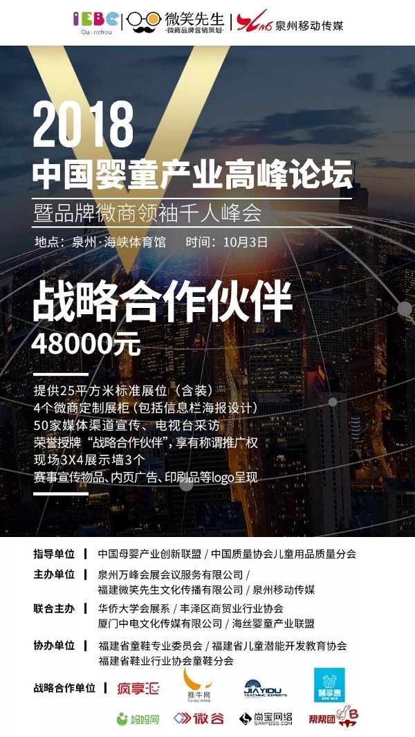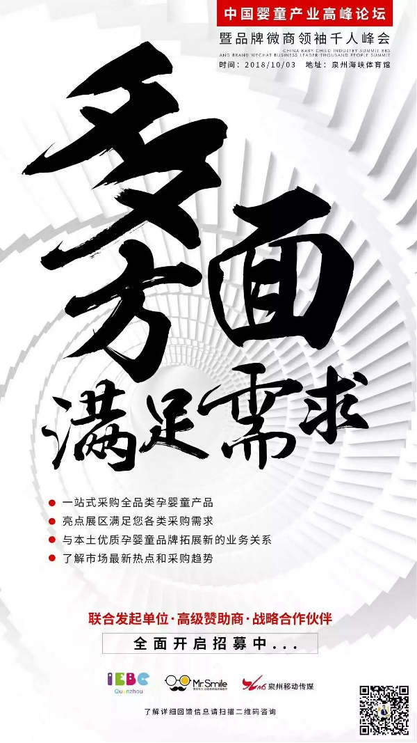 2018年對(duì)于中國的嬰童行業(yè)而言,可謂是喜憂參半! 在“全面二孩”政策紅利顯現(xiàn)及“第三次嬰兒潮”中產(chǎn)生的育齡人口大基數(shù)下,母嬰市場迎來人口紅利,越來越多的機(jī)構(gòu)和個(gè)人紛紛涌入母嬰產(chǎn)業(yè)。 然而,隨著消費(fèi)升級(jí)的驅(qū)動(dòng),母嬰消費(fèi)者從過去的功能型消費(fèi)力為主向情感滿足型轉(zhuǎn)變。同時(shí),在移動(dòng)互聯(lián)網(wǎng)時(shí)代,創(chuàng)新思維源源不斷,商業(yè)模式變化多端,傳統(tǒng)母嬰受到莫大沖擊。 在母嬰行業(yè)的浪潮中,從來不缺乏創(chuàng)業(yè)者和投資者,而能一路堅(jiān)持輝煌到底的人少之又少。怪咖認(rèn)為母嬰店若想發(fā)展,首先要轉(zhuǎn)變一成不變的思想,緊跟時(shí)代潮流。 微商的立法及“雙創(chuàng)理念”的提出,催化了微商行業(yè)的迅速發(fā)展。要想做好嬰童產(chǎn)業(yè),除了抓住這個(gè)市場,還可以利用互聯(lián)網(wǎng)+,實(shí)行線上線下O2O經(jīng)營新模式。新時(shí)代、新市場、新要求,逐步落地實(shí)踐以形成全新的母嬰產(chǎn)業(yè)鏈。 新趨勢、新常態(tài)、新嬰童的背景下,福建首屆中國嬰童產(chǎn)業(yè)高峰論壇暨品牌微商領(lǐng)袖千人峰會(huì)將于2018 年10 月3 日在泉州·海峽體育館隆重舉辦。 本次活動(dòng)依托泉州地區(qū)雄厚的產(chǎn)業(yè)優(yōu)勢和優(yōu)越的消費(fèi)市場,以童裝童鞋為主特色匯集各類嬰童系列產(chǎn)品和最新技術(shù),為區(qū)域范圍內(nèi)嬰童用品商企搭建集商貿(mào)洽談、形象展示、品牌推廣、市場開拓、渠道營銷、學(xué)習(xí)交流于一體的綜合性展覽平臺(tái),加強(qiáng)嬰童用品商家企業(yè)間的交流與合作,為行業(yè)品牌化、專業(yè)化的發(fā)展提供更加廣闊的空間。