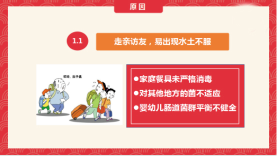 1、走親訪友,易出現水土不服,尤其是腸道系統發育還不太完善的寶寶們,極易出現腹瀉、消化不良等問題;