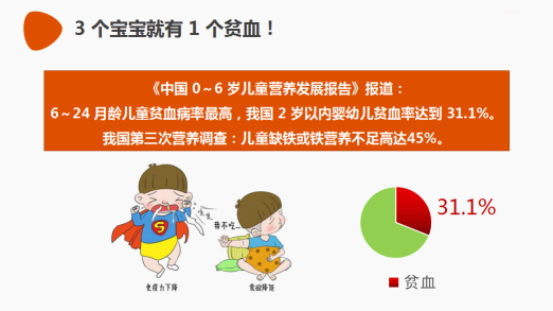 作為寶媽,你可知道,“缺鐵性貧血”為世界四大營(yíng)養(yǎng)缺乏疾病之一,3個(gè)寶寶就有1個(gè)貧血,而缺鐵危害不可逆! 《中國(guó) 0~6 歲兒童營(yíng)養(yǎng)發(fā)展報(bào)告》報(bào)道:6~24 月齡兒童貧血病率最高,我國(guó) 2 歲以內(nèi)嬰幼兒貧血率達(dá)到 31.1%。我國(guó)第三次營(yíng)養(yǎng)調(diào)查:兒童缺鐵或鐵營(yíng)養(yǎng)不足高達(dá)45%!