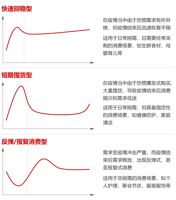圖片來源:麥肯錫 中長期方面,麥肯錫認為以下幾個方面可重點考慮: 1. 切實加快線上 /全渠道舉措的落地推廣。 2. 推出一套有針對性的收益管理計劃。 3. 重新思考供應鏈戰略,優化供應鏈設計和運營。 -02- 貝恩公司 近日,公司貝恩公司發布的《疫情之后,零售企業的“危”與“機”》報告指出,回顧以往的疫情或自然災害,零售市場一般會經歷三個階段:沖擊、恢復和回穩。 在疫情對消費者行為和偏好的影響方面,為了更好地進行分析討論,我們將商品零售場景分為9大類,分別是:生鮮食材、休閑飲食、聚會節慶、母嬰育兒、個人護理、家庭清潔、健康防護、服裝服飾、電子電器。 貝恩發現,不同場景在疫情結束后的需求模式和變化各不相同,大致可分為三類: